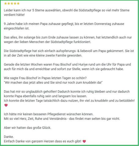 Wir Mitarbeiter der Südstadtpflege sehen unsere Hauptaufgabe darin, jeden Menschen unter Berücksichtigung seiner physisch funktionalen, psychosozialen, geistigen, spirituellen und kulturellen Bedürfnisse sowie Fähigkeiten umfassend zu pflegen mit dem Ziel, ein selbst bestimmtes Leben führen zu können. Ist die Eigenverantwortung und Selbständigkeit eingeschränkt oder zurzeit nicht gegeben, sehen wir unsere Aufgabe darin, diese wieder herzustellen oder beratend und unterstützend dem Patienten sowie seinen Angehörigen zur Seite zu stehen.